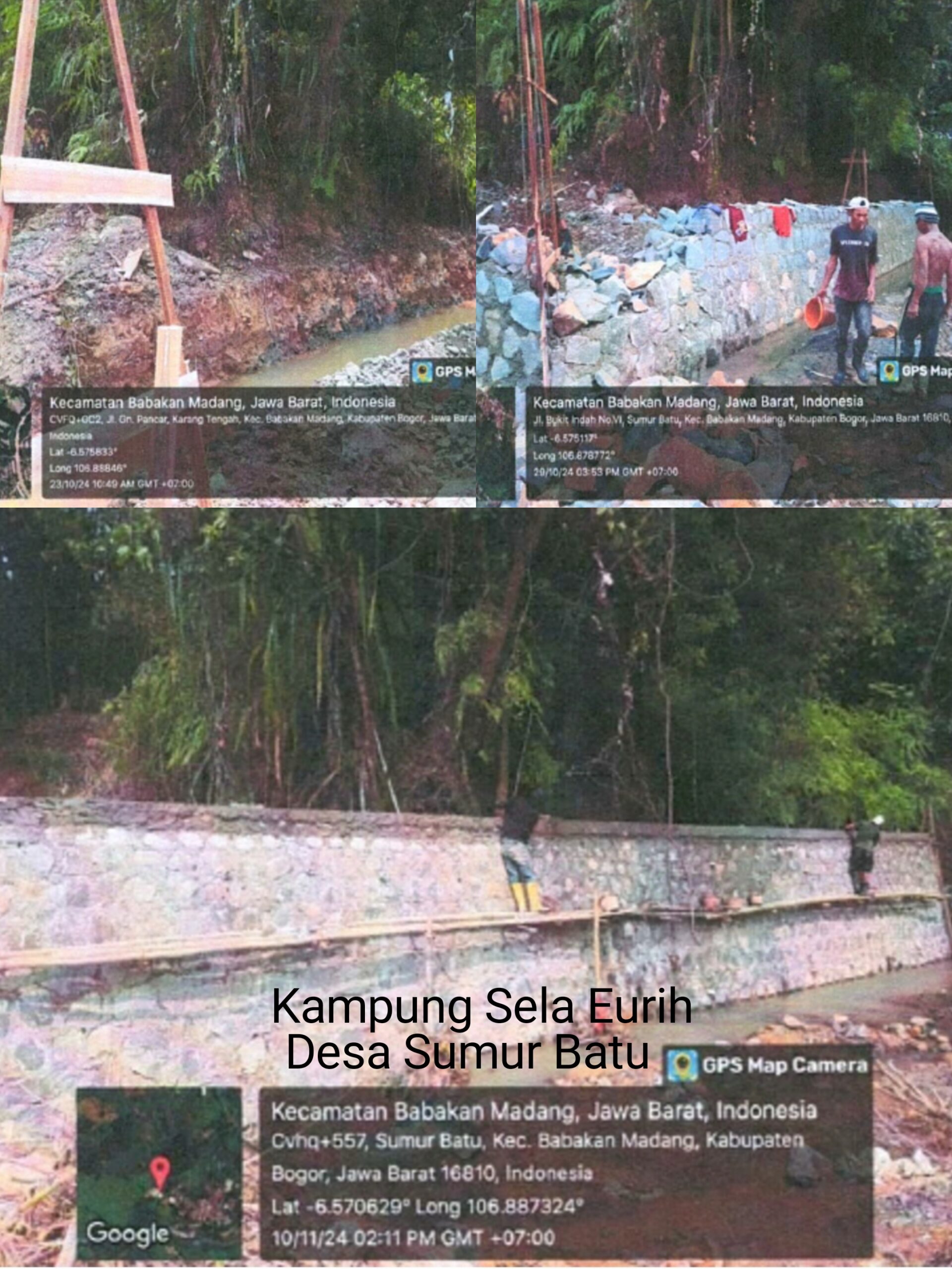 Lokasi 1 : Pembangunan Tembok Penahan Tanah (TPT) di Kampung Sela Eurih RT012 RW004 dengan volume 70 M X 1.1 M X 3.5 M menggunakan anggaran sebesar Rp 313.832.000.-